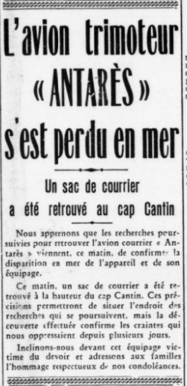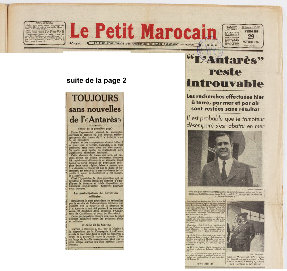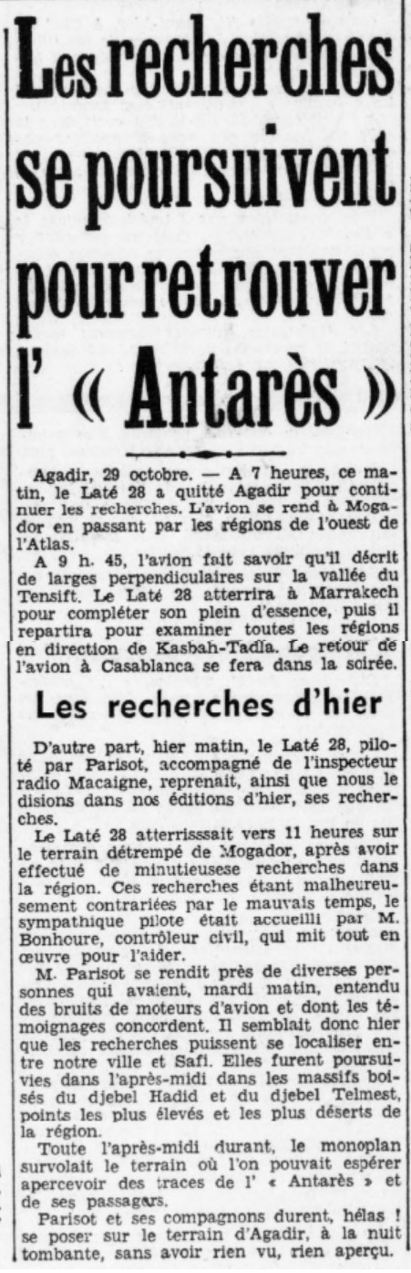 Recherche Antarès désespérément par air mer et terre Mercredi 27 octobre 1937