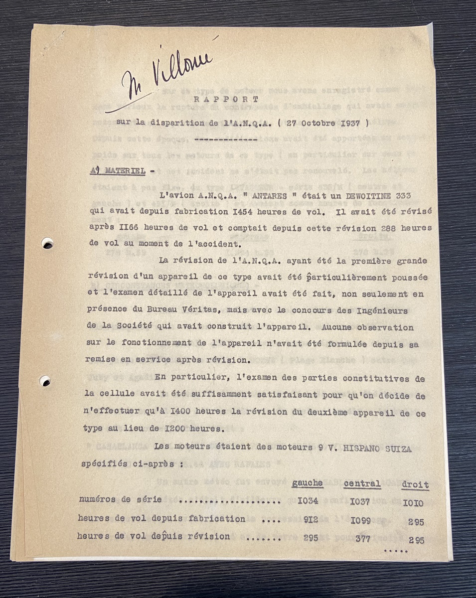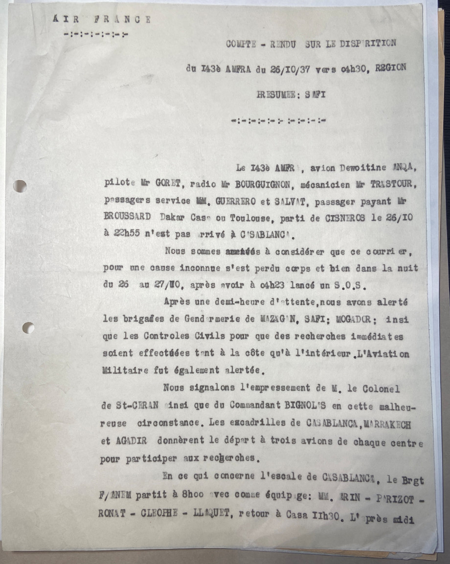 orage au Maroc, l'avion fut perdu fin octobre 1937, lors d'un vol retour au