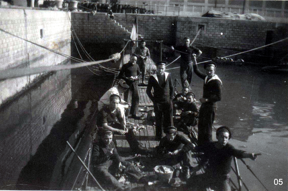 – Travail d’entretien, par l’équipage du sous-marin Méduse, dans le Port de Casablanca. (Collection Jean-Louis Fichet)