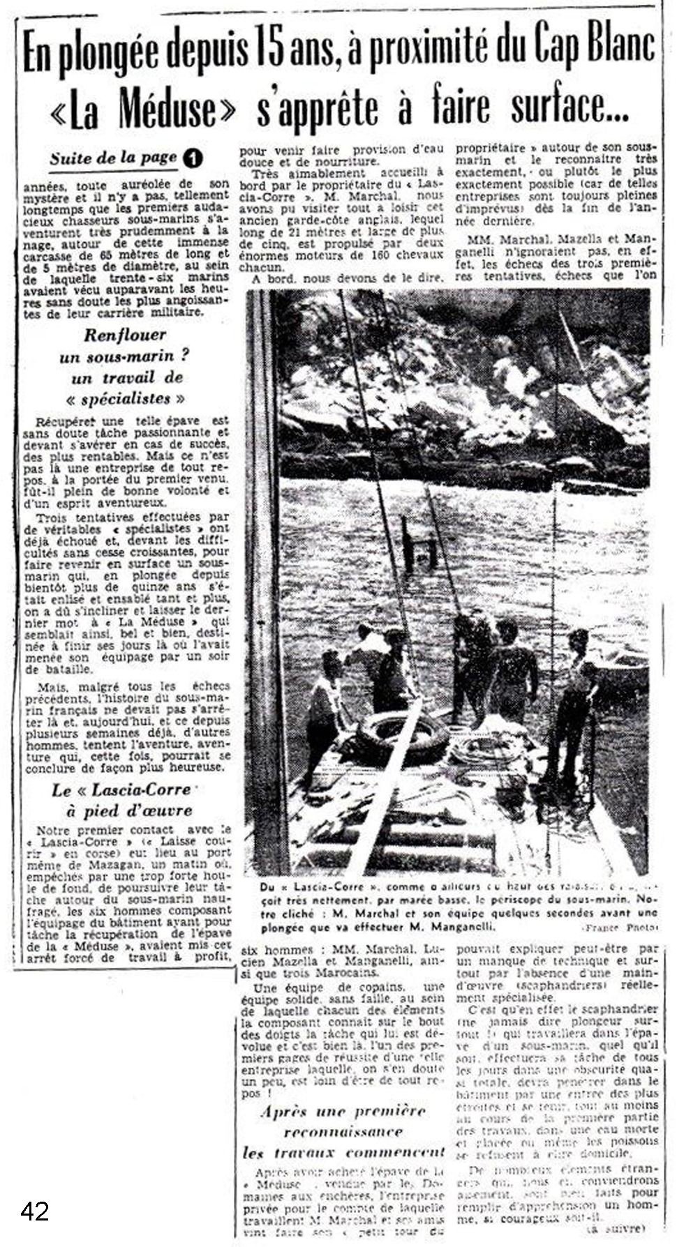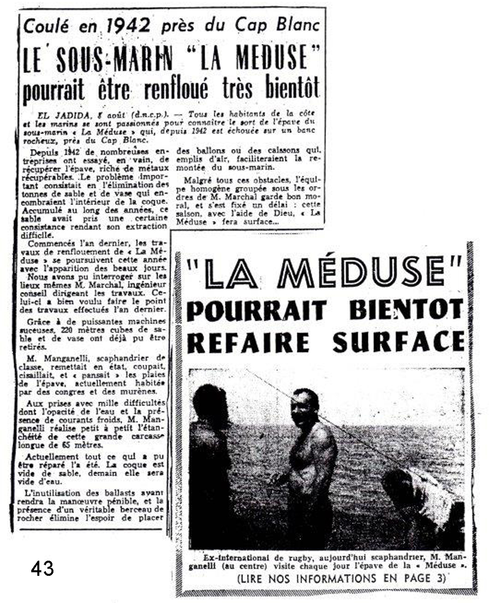 CONTRE GOLIATH Le sous-marin Méduse, appareilla à 5h50 sur ordre. Il se positionna au large du port de Casablanca en immersion périscopique pour attendre l’arrivée de l’escadre « ennemie ». Une cible de choix se présenta : l’imposant cuirassé USS Massachusetts. Comme dans un remake de David contre Goliath, le petit sous-marin bénéficiait seulement de l’effet de surprise. Il prit une route d’attaque et se positionna à 3800 mètres de sa cible. A 10h12, il lança successivement quatre torpilles sans faire mouche. Immédiatement pris en chasse et grenadé par les destroyers, il se déroba en plongeant à 25 mètres. Le commandant décida de faire surface pour revenir dans l’avant-port de Casablanca vers 13h20. Deux groupes de trois chasseurs catapultés d’un porte-avions en profitèrent pour frapper et endommager gravement le submersible. Les ballasts arrière crevés par les rafales de mitrailleuses de 12.7 diminuaient considérablement la mobilité du navire. Trois marins furent blessés sur le pont : L’EV Salmon touché au ventre et à la cuisse et les QM Fichet, poignet brisé, et Quemard, biceps gauche arraché. Pendant 36 heures, le LV Roy tenta de sauver son bateau et s’approcha du Cap Cantin. L’officier en second Jean Dischamps et deux marins prirent place à bord d’un canot pour essayer de reconnaître la côte afin d’aborder. En raison de la forte houle de fond, l’ordre fut donné aux hommes de l’embarcation de rejoindre le port de Safi à la rame. Ils furent capturés et internés par les soldats Américains occupant la ville.