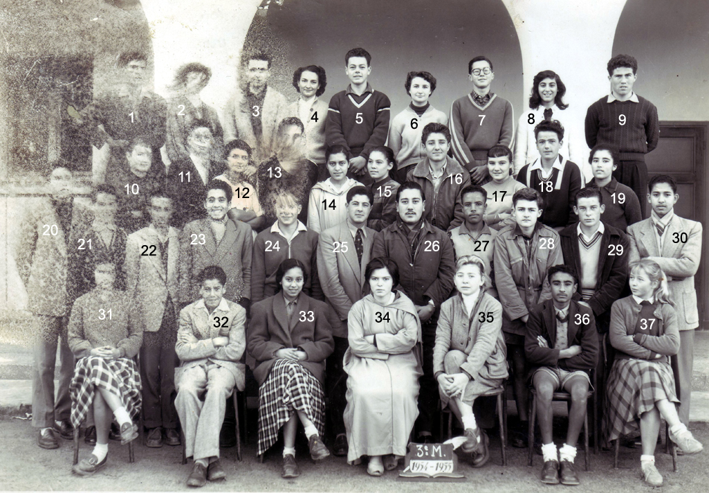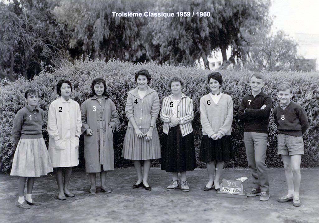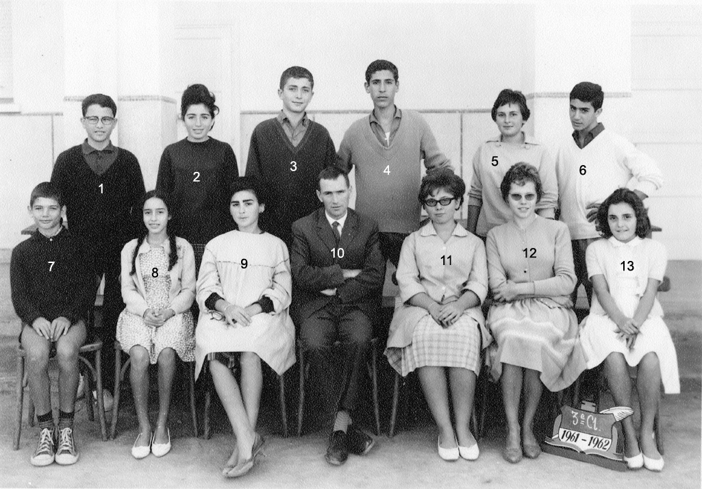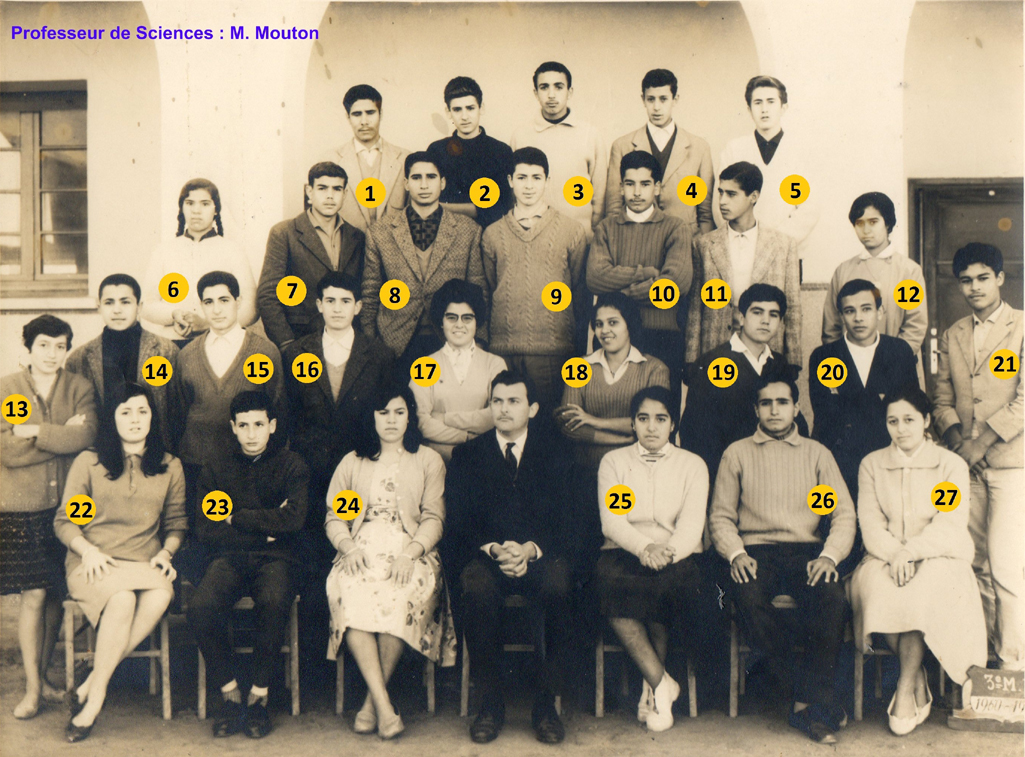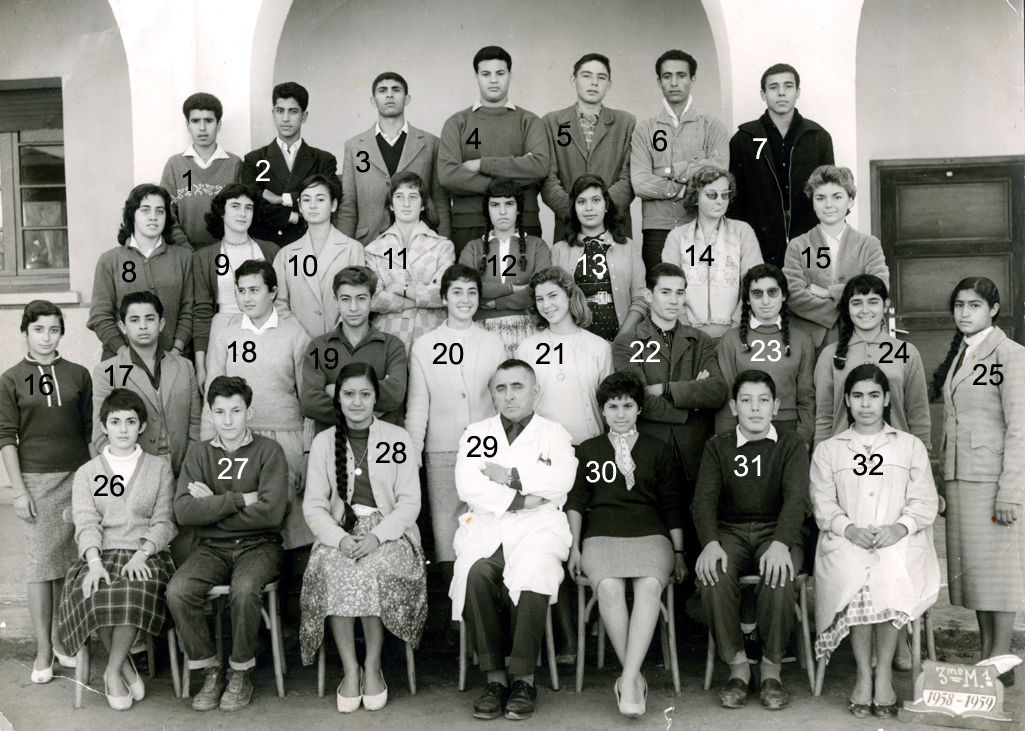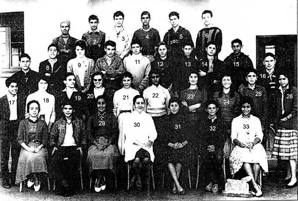 1 - ? 2 - ? 3 - BLANCHARD Jeanine 4 - BENSAHEL Michel 5 - 6 - COMBES Bernard 7 - BISQUAY Jacques 8 - ELMALEM Léon 9 - OIKNINE Esther 10 - 11 - BENISSE Alice 12 - 13 - 14 - 15 - ZNATY Roda 16 - FOCH Anne-Marie 17 - NAIM ? 18 - ARIF Elisabeth 19 - MEGNIN Suzanne 20 - 21 - 22 - 23 - 24 - 25 - 26 - 27 - ABITBOL Denise 28 - 29 - PIERRARD Jacqueline (Photo transmise par