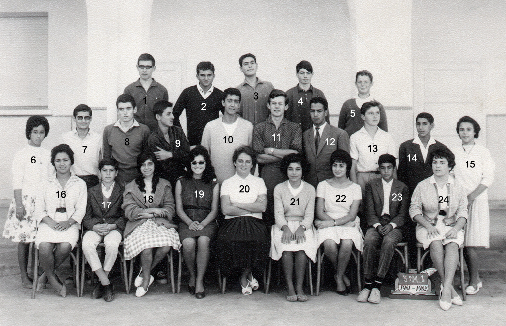 1 - BENAZRA Jo 2 - PYROUZ Cyrrus 3 - NIZRI Simon 4 - 5 - PARODI Jacques 6 - 7 - ABERGEL André 8 - SINTES Claude 9 - LEMSEFFER 10 - OHAYON Daniel 11 - GRAULICH Achim 12 - TIBARI 13 - PACHOT Michel 14 - 15 - BRIHOUM Mina 16 - 17 - AÏT-KACI 18 - ELBAZ Mercedes 19 - PEREZ Vincente 20 - Mme VINAY (Hist-géo) 21 - ABERGEL Danielle 22 - AMAR Danielle 23 - BOUMELHA Abdelkrim 24 -LOPEZ Danielle (Photo transmise