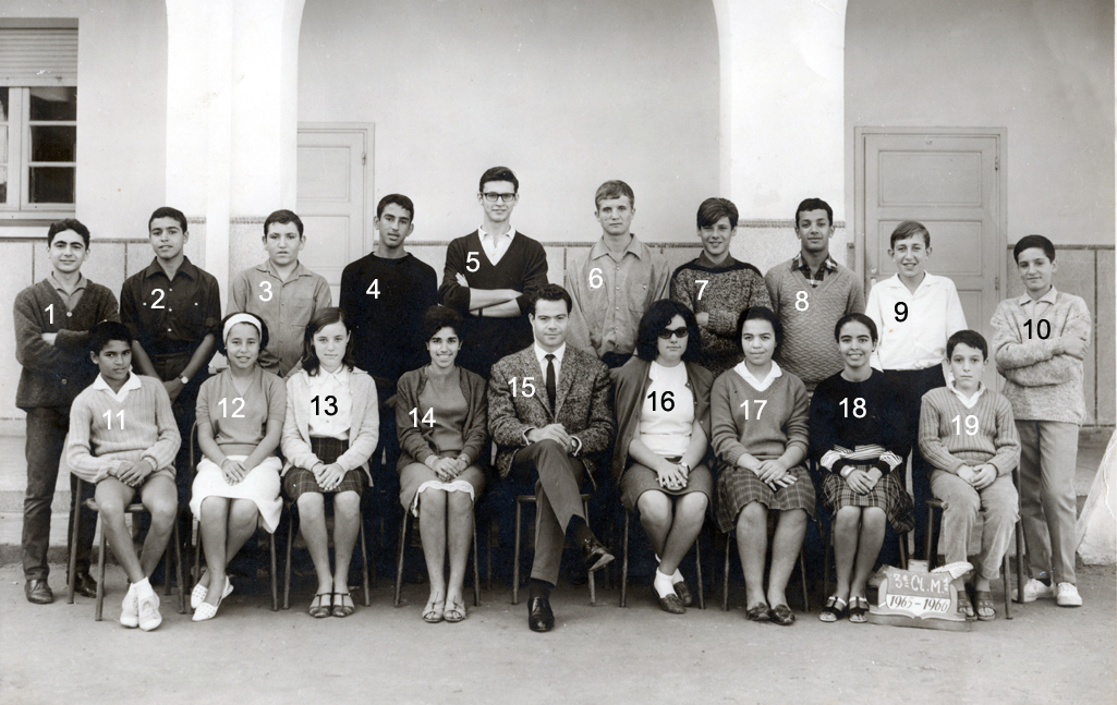 1 - BENSIMON Jimmy 2 - BOUCHTIA Mustapha 3 - CARN Roger 4 - BOUMELHA Abdeljebbar 5 - OCHMANN Lucien 6 - MARE Jean-Claude 7 - TILLIETTE Jean-Pierre 8 - 9 - BENSAHEL Jacques 10 - SENOUSSAOUI ? Abderrazak 11 - MARJANI Saïd 12 - TALIB Saadia 13 - TACKX Catherine 14 - EL HAOUARI Bouchra 15 - BERNARD Guy (prof Fr) 16 - CAFFIN Martine 17 - ? Fatima 18 - 19 - BENCHERKI Mustapha Absente: Farida ELAZRI ENNACIRI (photo transmise par