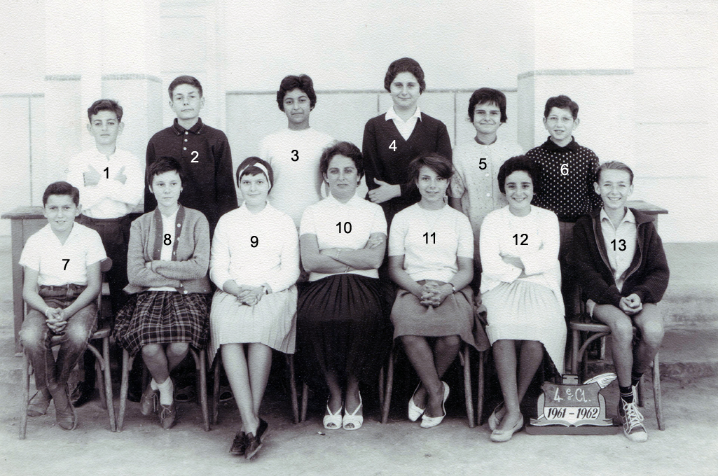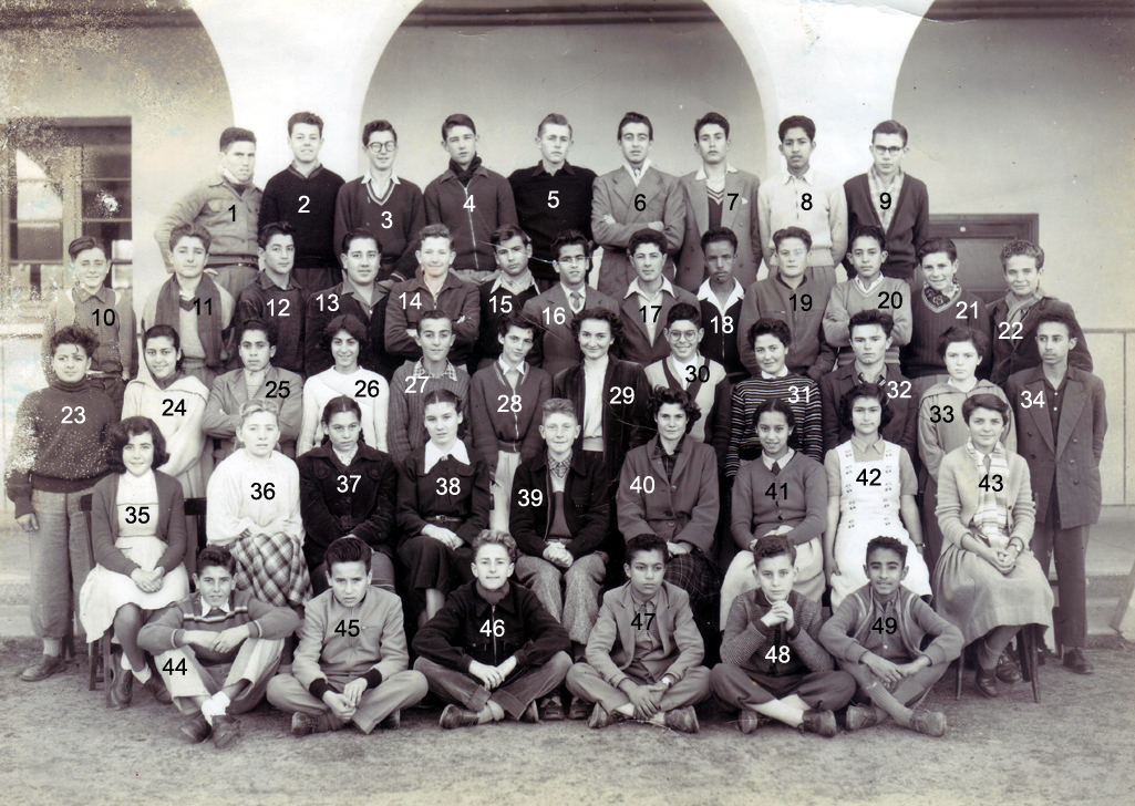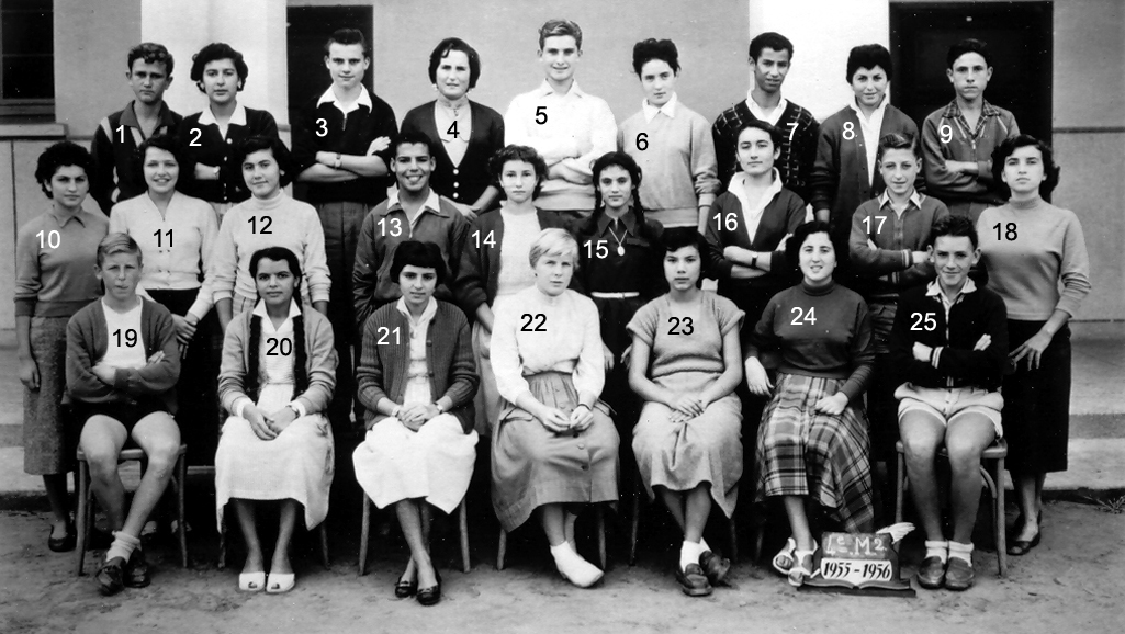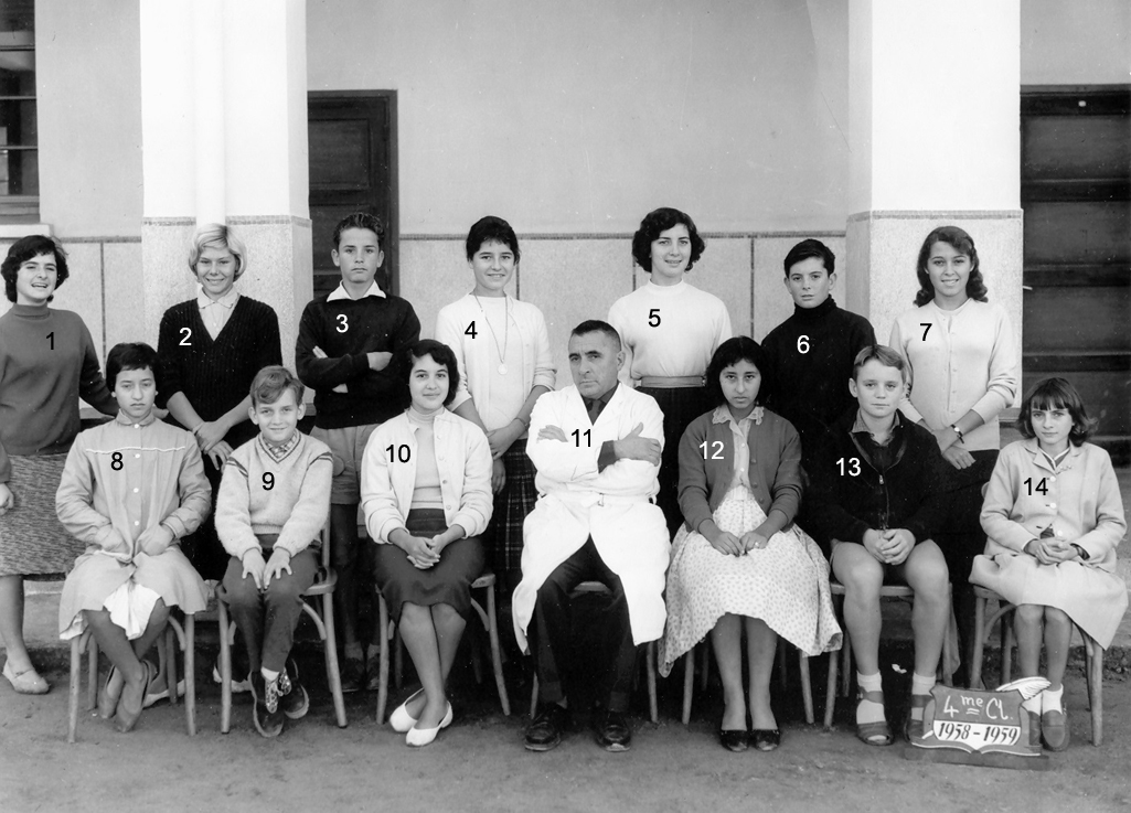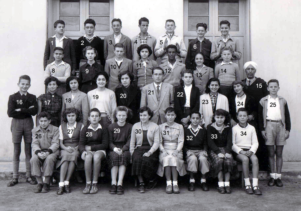 2 - ? 3 - ? 4 - AARON 5 - EL FASSI ? 6 - SEMAC ? 7 - ? 8 - BLANCHARD Jacques 9 - ? 10 - ? 11 - BRANDSTAETTER Yvette 12 - FABRE Micheline 13 - GUILLEMON Jeanine 14 - GIRAUDEL 15 - LEVY ? 16 - ? 17 - DELVOYE 18 - ? 19 - VELINGER 20 - BRUNO Suzanne 21 - NOGUÉ Jeanine 22 - AZIZA Reine 23 - BENSIMON Photo transmise par