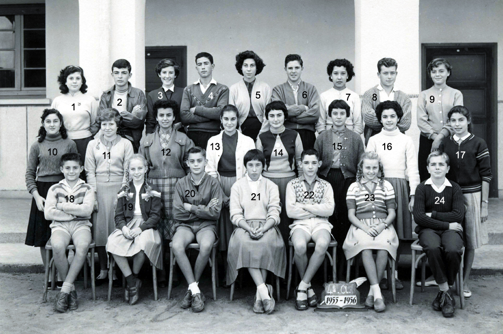 1955 - 1956 4 ème Classique 1 - ELBAZ Nadia 2 - DUFOUR André 3 - LAUGERIE Marie-Paule 4 - ASSEDO Momi 5 - CAMP Paulette 6 - BENSIMON David 7 - MATHIEUX Marie-France 8 - 9 - PASQUIER Yvette 10 - BENCHETRIT Annette 11 - PIERARD Hortense 12 - QUEMADA ? 13 - POLI Marie-Paule 14 - GRIGUER Josiane 15 - FABRE Anne Marie 16 - MAIMARAN ou ABERGEL Juliette ? 17 - RIOS Danièle 18 - REVOLE François 19 - KULCZEWSKI Marie-France 20 - De GAILLANDE Philippe 21 - CHRISTOFARI Marie-Antoinette 22 - MAÏNETTI Bernard 23 - BARGAIN Michèle 24 - DELPECH Jean-Paul (Photo transmise par