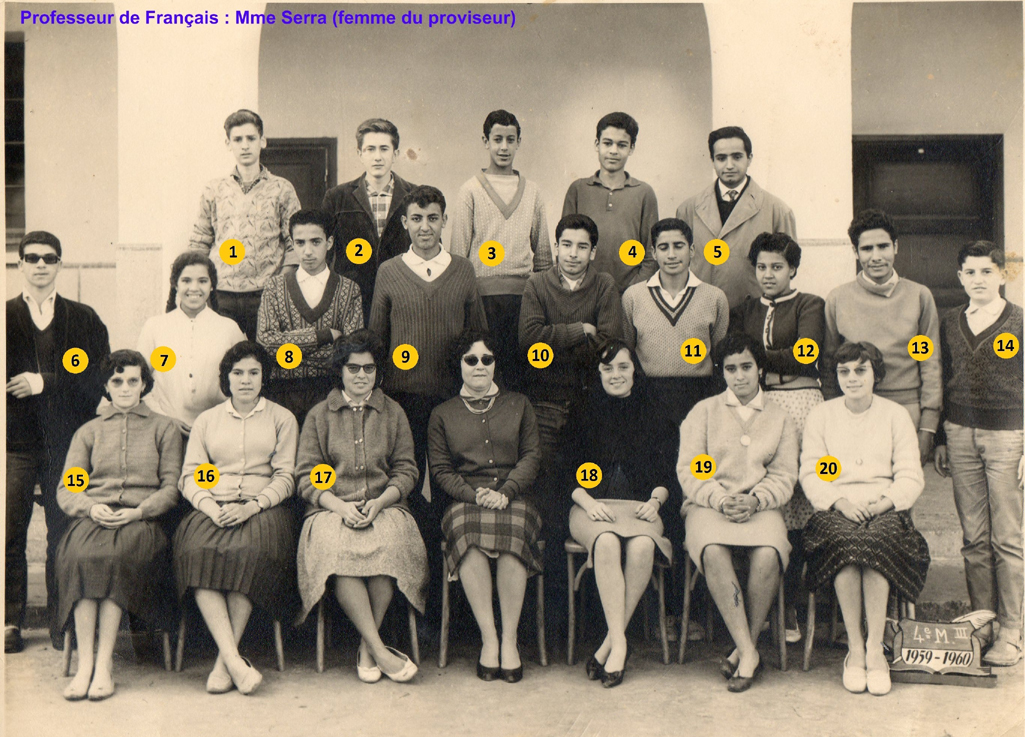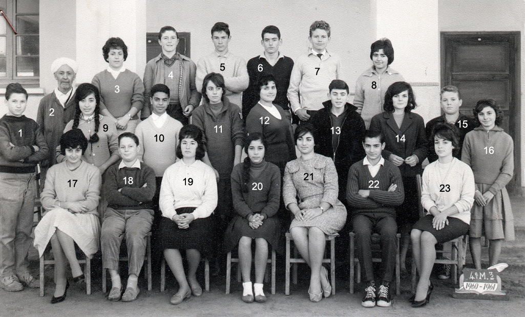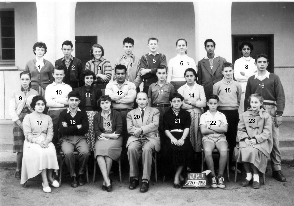 1 - ASSEDO 2 - LEBARS Annie 3 - BENDELAC Roger 4 - SAMBRANA Colette 5 - MALLET Michèle 6 - GUELFI ? 7 - ELBAZ Nadia 8 - LAREDO Jacky 9 - AMOR Abdelatif 10 - 11 - MEGNIN 12 - HAZIZA Dédé 13 - 14 - BENCHETRIT ? 15 - 16 - BENSIMON David 17 - M. FABRE Roland (Math) 18 - FABRE Claude 19 - AZOULAY Ida 20 - 21 - (Photo transmise par Claude FABRE)