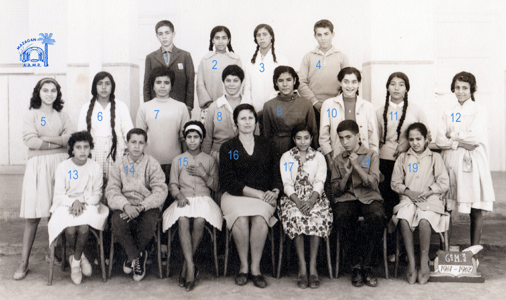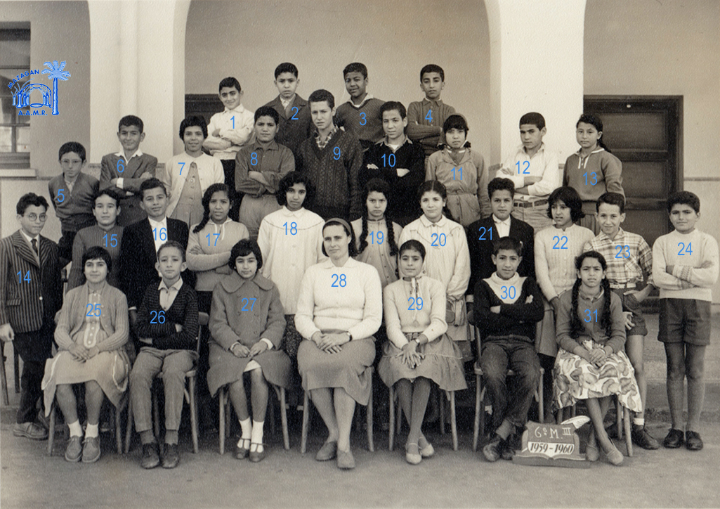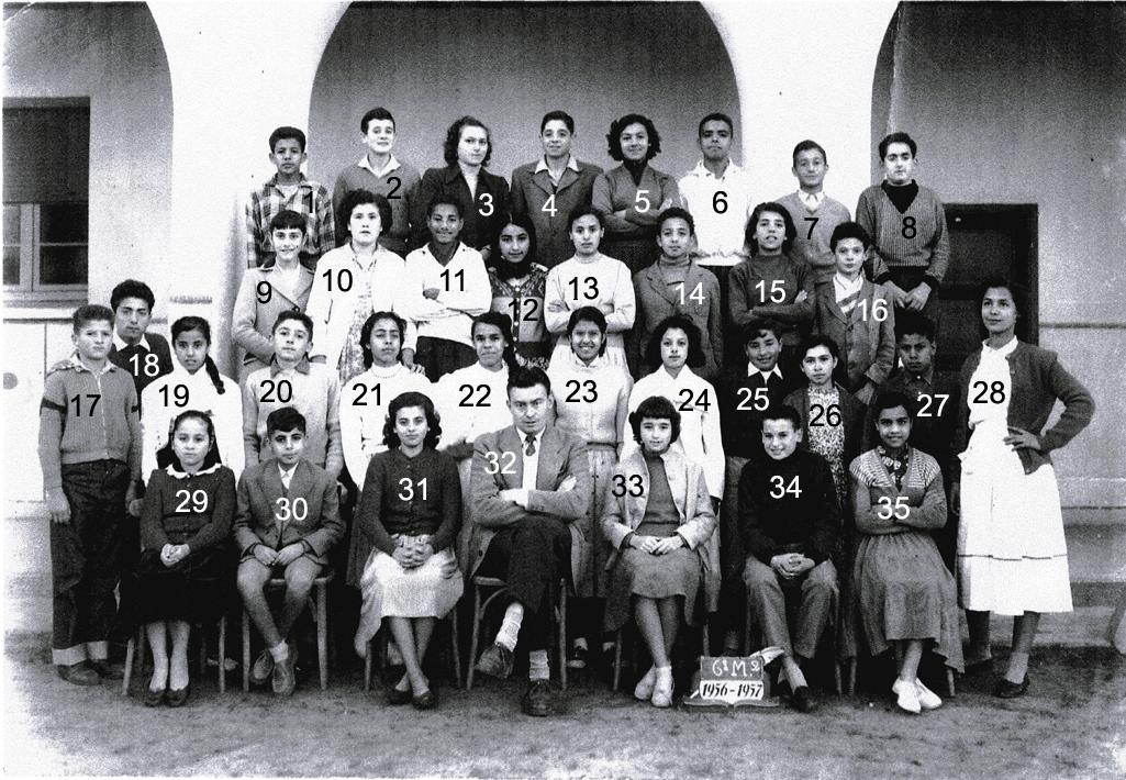 1 - AMAR Danielle 2 - SEMLALI 3 - BENJELLOUN 5 - ALAOUI Abdelaziz 6 - EL MOUTOUAJ Mustapha 7 - BAHMET Ghanima 10 - ASSAYAG Clarisse 14 - LOPEZ Janine 17 - PEREZ Michèle 19 - HATEM Andrée 22 - BERRADA 23 - LAHJI Irène 25 - JAFFAR Latifa 26 - BACLE Janine 27 - MAALOUMI Yamina 29 - BOUMELHA Abdelkrim 30 - BRIHOUM Mina 32 - Mlle BONNEMAISON (Prof de sciences nat.) 33 - TOUNSI Abdellatif 35 - AÏT-KACI Mahmoud (Photo transmise par