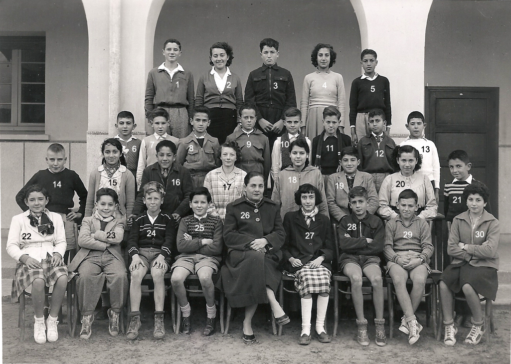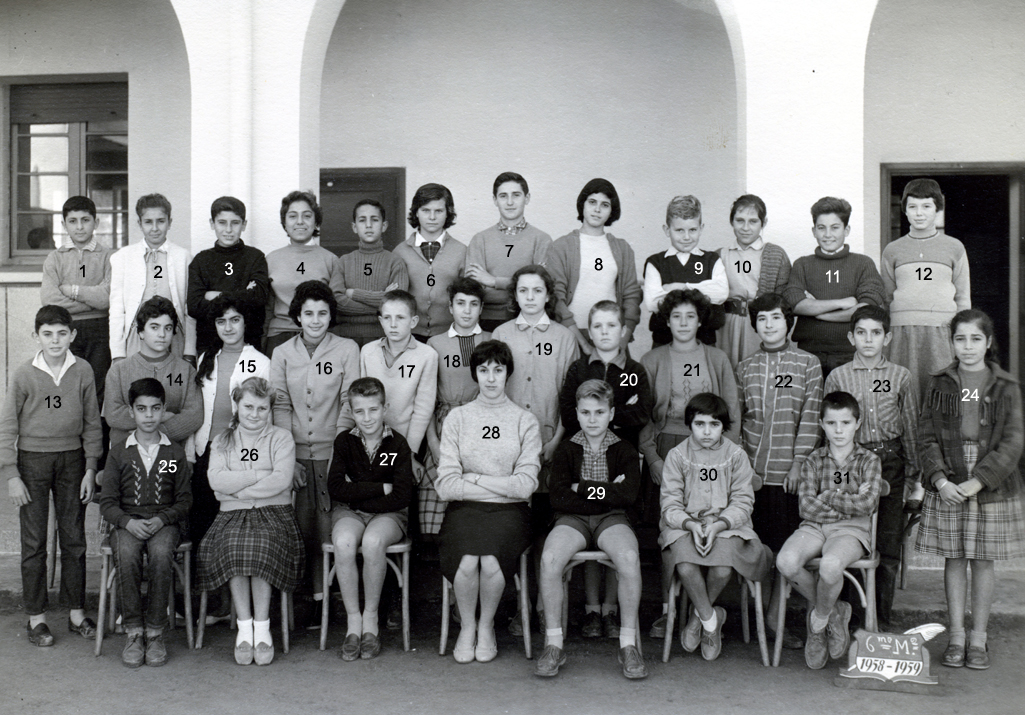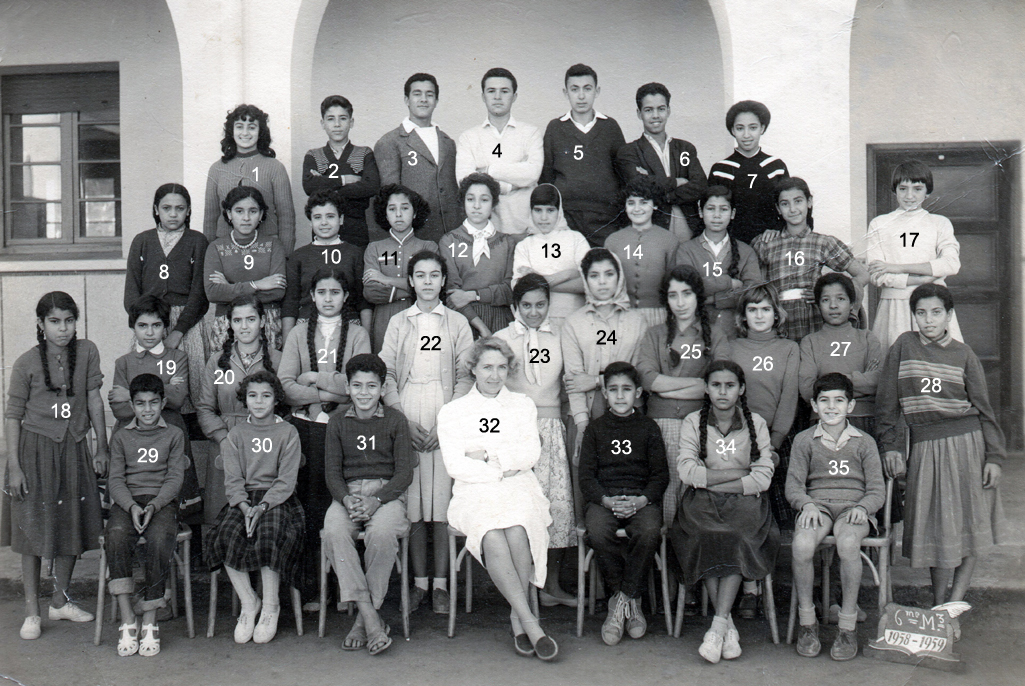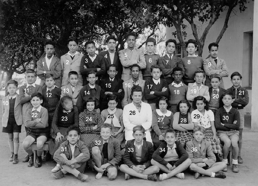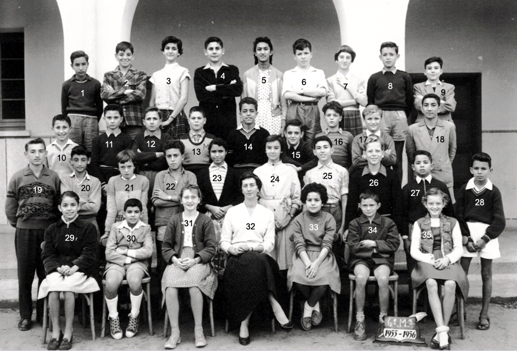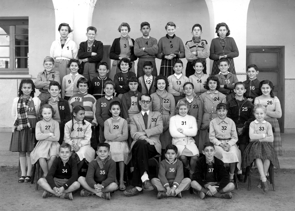 1 - LAGI Irène 2 - DOS SANTOS Marie-Thérèse 3 - 4 - PLEYEL Marguerite 5 - LOPEZ Janine 6 - NAHON Daniel 7 - AMIEL Sylvia 8 - 9 - LALOU 10 - 11 - BACLE Janine 12 - MARCO Jacqueline 13 - RENAUDIN Marie-Françoise 14 - HANOUNA Liliane 15 - FABRE Yvette 16 - BOUJIBAR 17 - LEPINE Marie-Paule 18 - 19 - 20 - BOTTA Liana 21 - BOUHADANA Albert ? 22 - BOLGIL Danièle 23 - LOPEZ Madeleine 24 - RIBEIRO Jean-Marie 25 - PEREZ Michèle 26 - DOS SANTOS ? 27 - 28 - PARODI Jacques 29 - DANAN Myriam 30 - ELBAZ 31 - Mme SERRA (Femme du Directeur du Collège) 32 - 33 - ELBAZ Fortunée 34 - ELMALEM Michel (photo ransmise par Liana BOTTA)