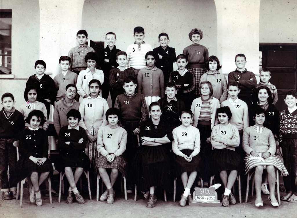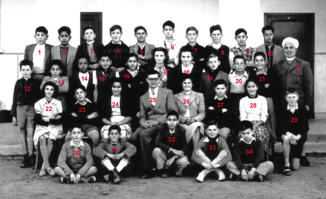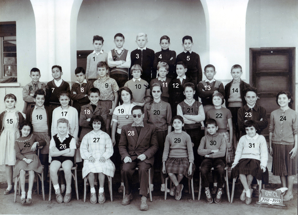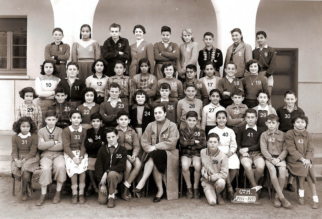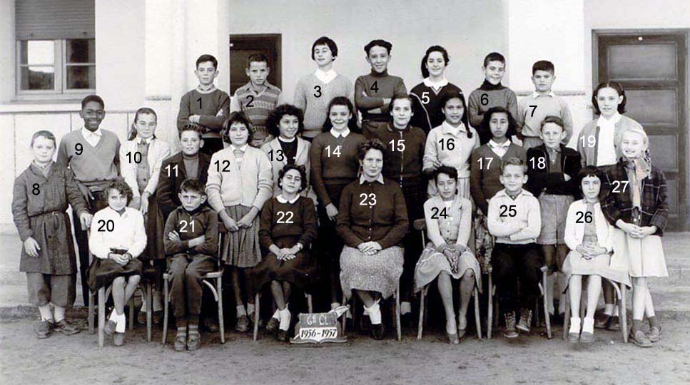 1 - LAGI Irène 2 - DOS SANTOS Marie-Thérèse 3 - 4 - PLEYEL Marguerite 5 - LOPEZ Janine 6 - NAHON Daniel 7 - AMIEL Sylvia 8 - 9 - LALOU 10 - 11 - BACLE Janine 12 - MARCO Jacqueline 13 - RENAUDIN Marie-Françoise 14 - HANOUNA Liliane 15 - FABRE Yvette 16 - BOUJIBAR 17 - LEPINE Marie-Paule 18 - 19 - 20 - BOTTA Liana 21 - BOUHADANA Albert ? 22 - BOLGIL Danièle 23 - LOPEZ Madeleine 24 - RIBEIRO Jean-Marie 25 - PEREZ Michèle 26 - DOS SANTOS ? 27 - 28 - PARODI Jacques 29 - DANAN Myriam 30 - ELBAZ 31 - Mme SERRA (Femme du Directeur du Collège) 32 - 33 - ELBAZ Fortunée 34 - ELMALEM Michel (photo ransmise par Liana BOTTA)