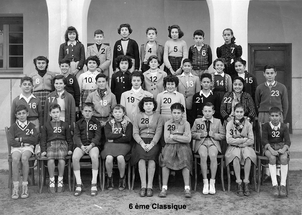 6 ème Classique 1 - 2 - ESCAICH Jean-Marie 3 - 4 - AMIEL 5 - De BIAZZO Katia 6 - ACHENZA Raymond 7 - 8 - BOUAFI Naïma 9 - DOUMECH Denis 10 - JEBLI Touria 11 - 12 - GUENARD Dominique 13 - 14 - GAUTHÉ Gérard 15 - GUILLEMAUD Daniel 16 - 17 - SLOWIK Jean-Pierre 18 - Faïza 19 - 20 - ERRAND Jean-Claude 21 - GONZALEZ 22 - 23 - ACHENZA Liane 24 - BENSAHEL Daniel 25 - BENARROCH Bella 26 - LARIVIERE Edith 27 - CARBOU Renée 28 - Mme WICHLINSKA prof de latin-français 29 - CHESNY Claudine 30 - ELKAÏM Rachel 31 - BENCHERQUI Laïla (photo transmise