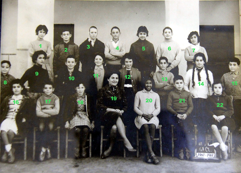 2 - CORREA Jacqueline 3 - RIBEIRO Jean-Marie 4 - MOUELFI Malika 5 - BOUJIBAR Driss 6 - CARBOU Renée 8 - NAHMANI Simone 9 - WYSS ? 10 - BOTTA Liana 13 - LOPEZ 14 - LOPEZ Danielle 15 - HANOUNA ? 16 - SLOWIK Nicole 17 - CARRARA Georges 18 - BENSIMON Nicole 20 - HOUZÉ Pascal 22 - MELLUL Liliane 23 - NAHON Daniel 24 - ABERGEL Danièle 25 - AMOR Driss (Photo transmise par Bernard HOUZÉ)