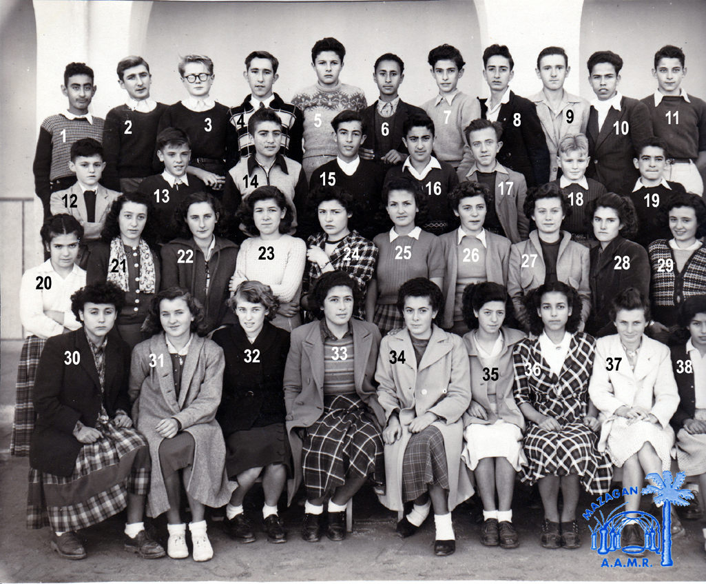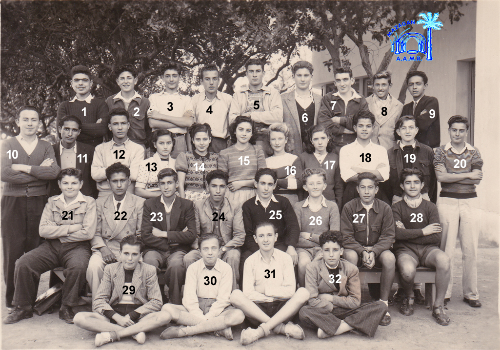 1 - BENDAHOU Taoufik 2 - TASSOT 3 - WAULT 4 - RUIMY Joseph 5 - MALARONI Denis ? 6 - ? 7 - SERRA 8 - BENISTY 9 - DENUILLY Alain 10 - ? 11 - ? 12 - ? 13 - ? 14 - HAZIZA 15 - ? 16 - ACOCA Jacques 17 - DENUILLY René 18 - HOLTZ Pierre ou CORTEGGIANI ? 19 - HAZIZA Joseph 20 - RUPERT Colette 21 - ? 22 - ? 23 - VINCENT Maryse 24 - PERGOLA Stella 25 - ANGÉLINI Marinette 26 - ADIGARD des GAUTRIES Aline 27 - BORGIA Gaby 28 - PERALDI Andrée 29 - MIRMANDE Monique 30 - RUIMY Anita 31 - ORMIERES Odette 32 - ? 33 - ? 34 - AMIEL Danielle 35 - ? 36 - ? 37 - POIRET Annie 38 - ? |