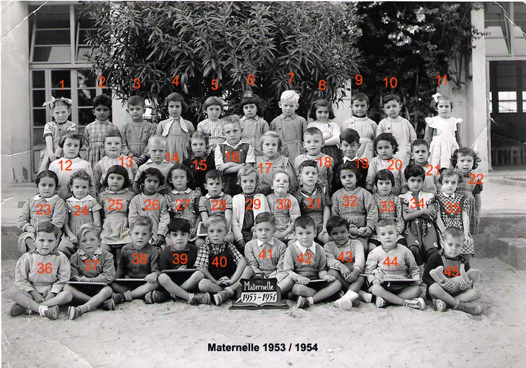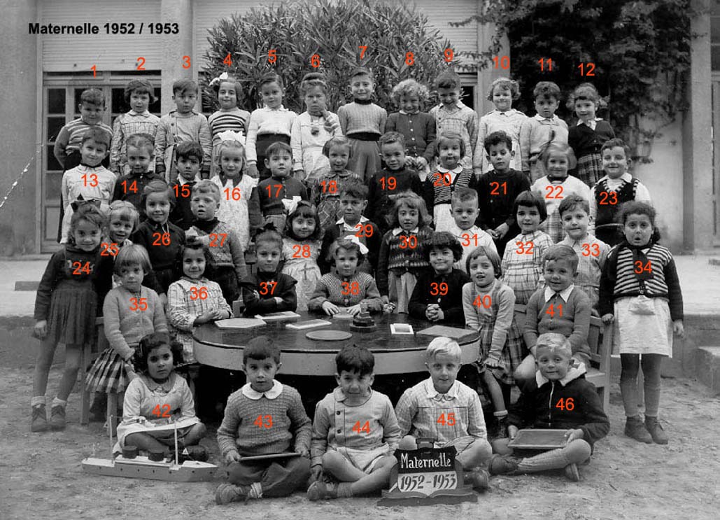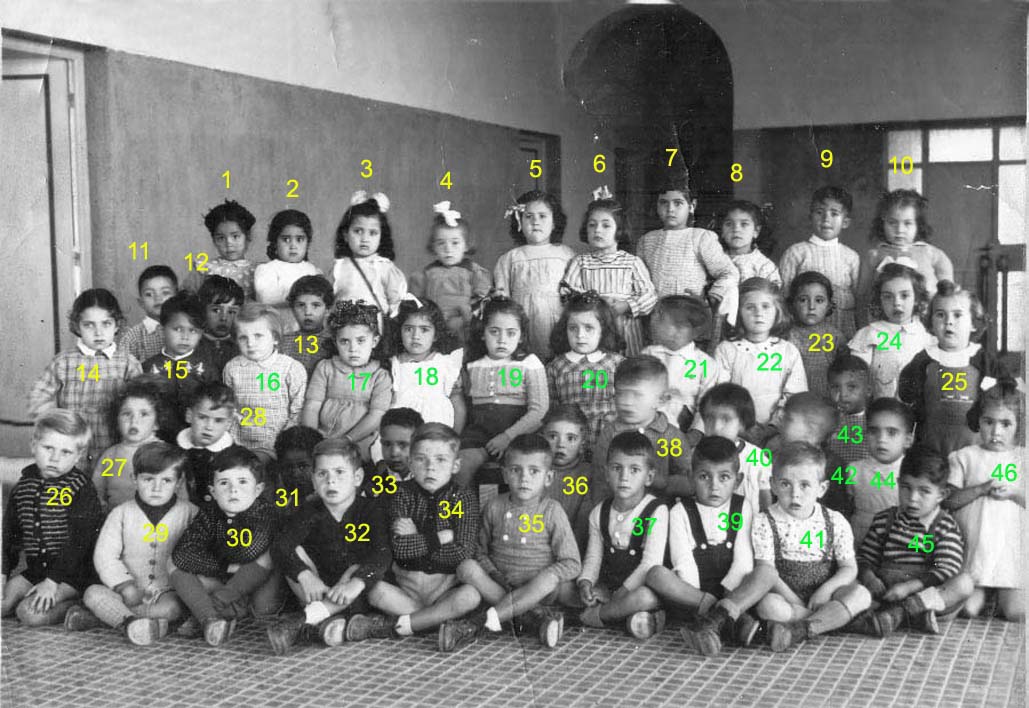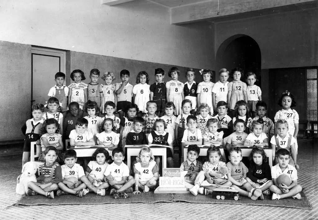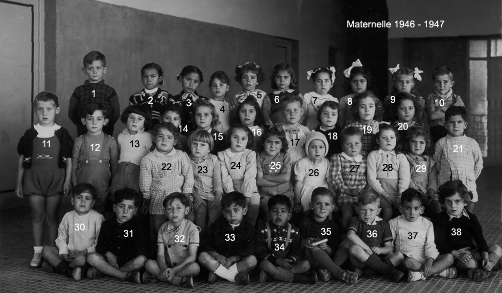 ![]() | 1946 - 1947 5 - FABRE Espérance 6 - BETTY Jeannette 7 - COHEN Camille 8 - ABERGEL Lorette ? 10 - VACHON Alain 12 - MAÏNETTI Bernard 13 - LOPEZ Claude 14 - HADADI Ftouma ? 15 - PUIG Gaby 16 - RIOS Danièle 17 - GONZALEZ Michèle 19 - AUGRAND Aline 21 - DIAZ André 22 - CANIZARES Carmen 23 - TASSOT Marie-Thérèse 25 - ? 26 - ALESSI Lucie 27 - JUFFE Maryvonne 28 - MAZZACO ? 29 - HAZIZA ? 30 - ? 31 - AÏT-KACI Rachid 32 - BENCHETRIT 33 - TIBARI 34 - BENGHANEM 35 - BAYARD Daniel 36 - MICHON 37 - SINTES José 38 - ? (Photo transmise