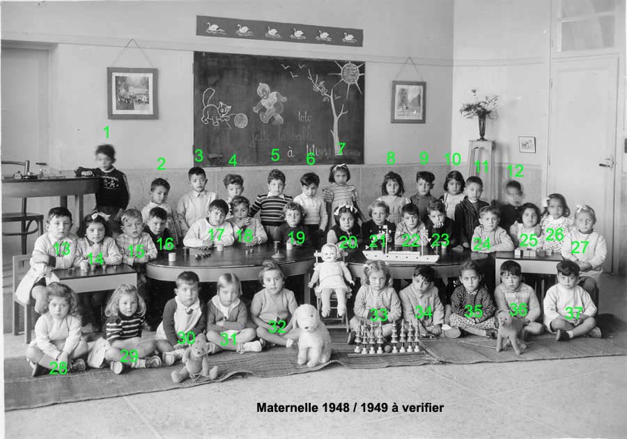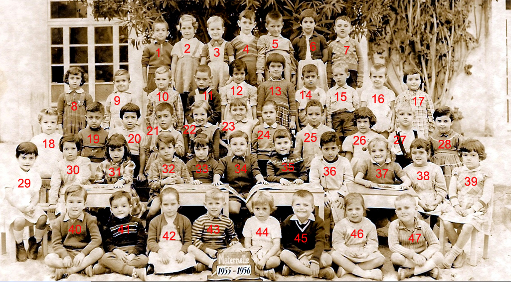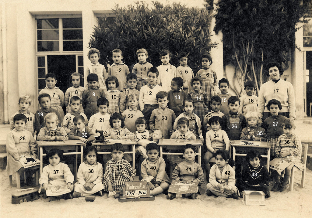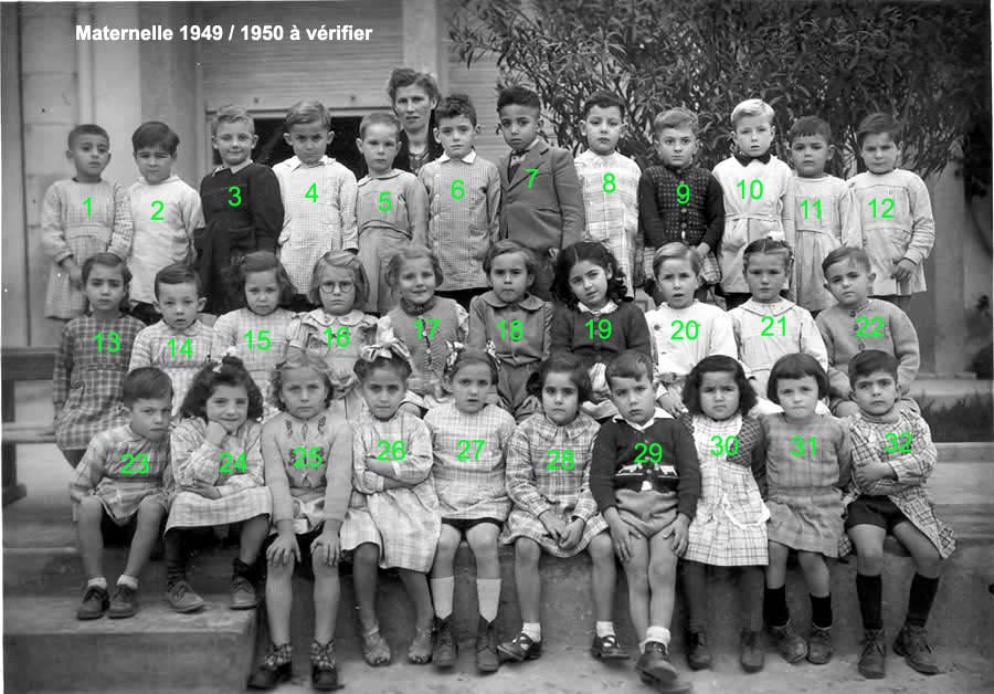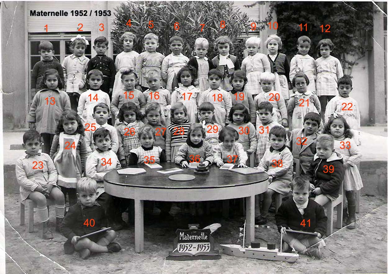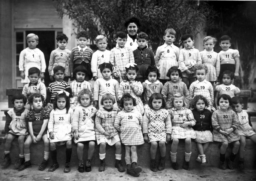 ![]() | 1946 - 1947 5 - FABRE Espérance 6 - BETTY Jeannette 7 - COHEN Camille 8 - ABERGEL Lorette ? 10 - VACHON Alain 12 - MAÏNETTI Bernard 13 - LOPEZ Claude 14 - HADADI Ftouma ? 15 - PUIG Gaby 16 - RIOS Danièle 17 - GONZALEZ Michèle 19 - AUGRAND Aline 21 - DIAZ André 22 - CANIZARES Carmen 23 - TASSOT Marie-Thérèse 25 - ? 26 - ALESSI Lucie 27 - JUFFE Maryvonne 28 - MAZZACO ? 29 - HAZIZA ? 30 - ? 31 - AÏT-KACI Rachid 32 - BENCHETRIT 33 - TIBARI 34 - BENGHANEM 35 - BAYARD Daniel 36 - MICHON 37 - SINTES José 38 - ? (Photo transmise