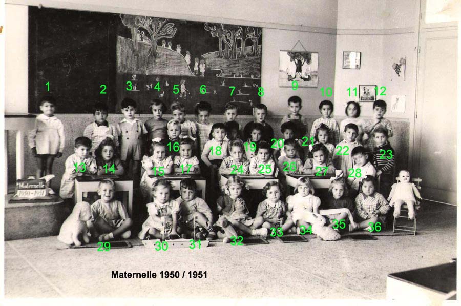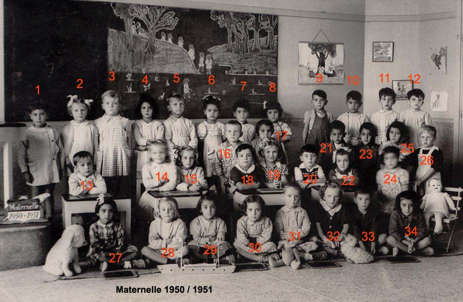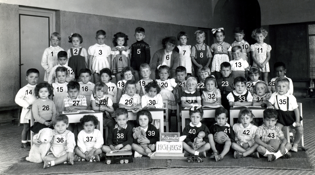 ![]() | 1950 - 1951 3 - POLI Félix 14 - PEREZ Vincente 15 - LEVRAT-HUYEZ Marie-Berthe 16 - CERRUTI ? 17 - ESPOSITO Monique 18 - KAROUTCHI Jimmy 22 - DE MARIA Jean-Paul 23 - LAPONTERIQUE Daniel 27 - ALESSI ? 31 - HOUZÉ Bernard 32 - HOLL Cathy 34 - LARAKI Lili 35 - MARCO Jacqueline (Photo transmise