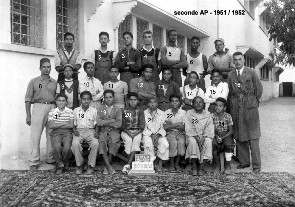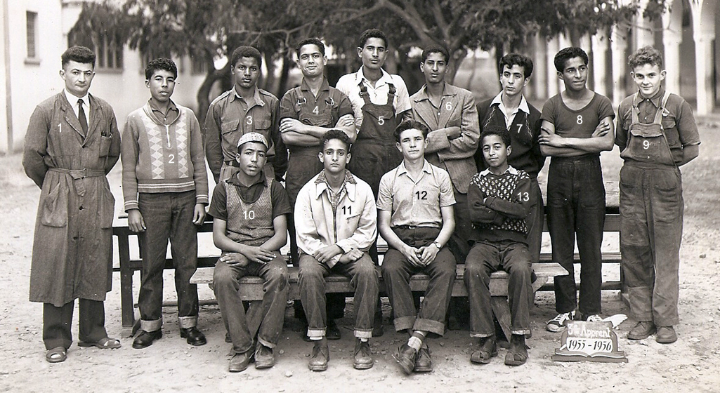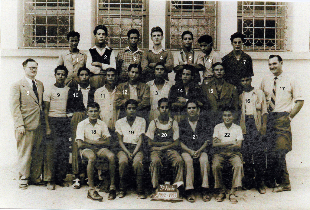 1 - LAHCEN 2 - 3 - 4 - POUQUET Claude 5 - 6 - 7 - 8 - Moktar, Prof de menuiserie 9 - 10 - 11 - LAFHAL Smain Jilali 12 - 13 - 14 - BELFAKIR Mustapha 15 - 16 - BONE, Prof de mécanique 17 - TABONE Guy 18 - BOUGRINE 19 - 20 - 21 - BEN AISSA 22 - RAHAL 23 - 24 - NACIRI (Photo transmise par Guy TABONE)