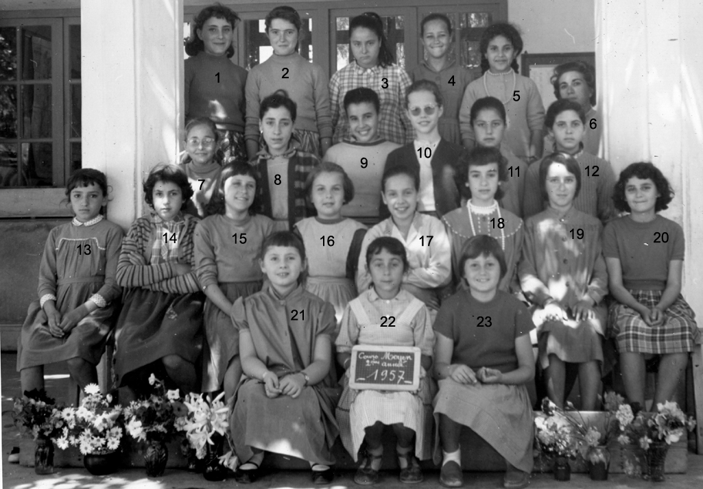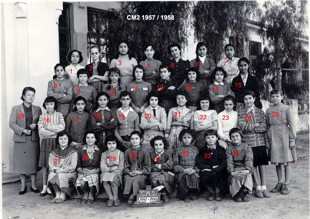 ![]() | 1957 - 1958 CM 2 1 - EL YAYAOUI Maria 2 - SPASSKY Catherine 3 - HASSAN Fatima 4 - JAFAR Latifa 5 - SLOWIK Nicole 6 - SEMLALI Rhadidja 7 - JAÏDI Zohra 8 - NAHMANY Simone 9 - PROT Mauricette 10 - PEREZ Michelle 11 - BOLGINE Danielle 12 - LOPEZ Danielle (ép. ARQUERO) 13 - LOPEZ Janine 14 - FLATRES Christiane 15 - RHAZOUANI Zoubida 16 - BEVILACQUA Gisèle 17 - HANOUNA Liliane 18 - ABDELHALIM Salima 19 - FERNANDEZ Marie Carmen 20 - BENSIMON Nicole 21 - MOHAMMEDI Fatima 22 - BOTTA Liana 23 - FOURNIER Chantal 24 - MELLUL Liliane 25 - SALVAGNAC Danièle 26 - Mme VESPERINI 27 - PECOT Françoise 28 - ACHENZA Liane 29 - HATEM Andrée 30 - BEYSSI Jocelyne 31 - JANOL Michèle 32 - SENOUSSI Najat 33 - GOLFAND Eve 34 - GONZALEZ Marie Antoinette
