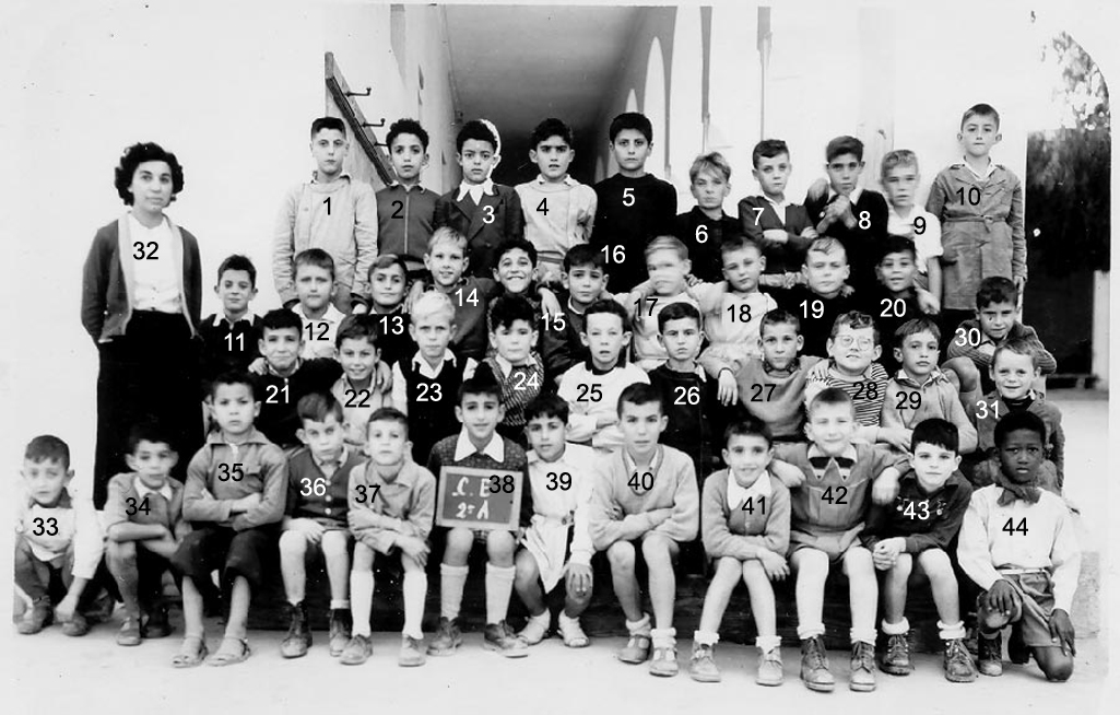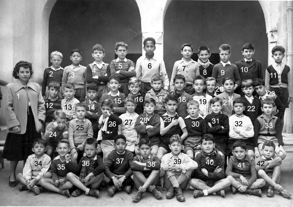 1 - 2 - GUILBERT ? 3 - LECCIA 4 - ABICIDAN 5 - SALINAS François 6 - VIDAL 7 - VIDAL 8 - VIDAL 9 - Madame DELALY 10 - BOURRET Pierre ? 11 - CARARA Georges 12 - 13 - 14 - 15 - GRAULICH 16 - YVARS Guy 17 - 18 - LOPEZ 19 - BENGHALEM 21 - SINTES José 22 - 23 - 24 - LAHLALI 25 - MARIE Jean-Jacques 26 - RIBEIRO Henri (Titou) 27 - FABRE Jean 28 - LESIEUR Henri 29 - CHRAIBI 30 - 31 - HOUZÉ Jean-Paul 32 - ACHILLI Jean-François 33 - BERNABEU Alain (Photo transmise par Jean FABRE)