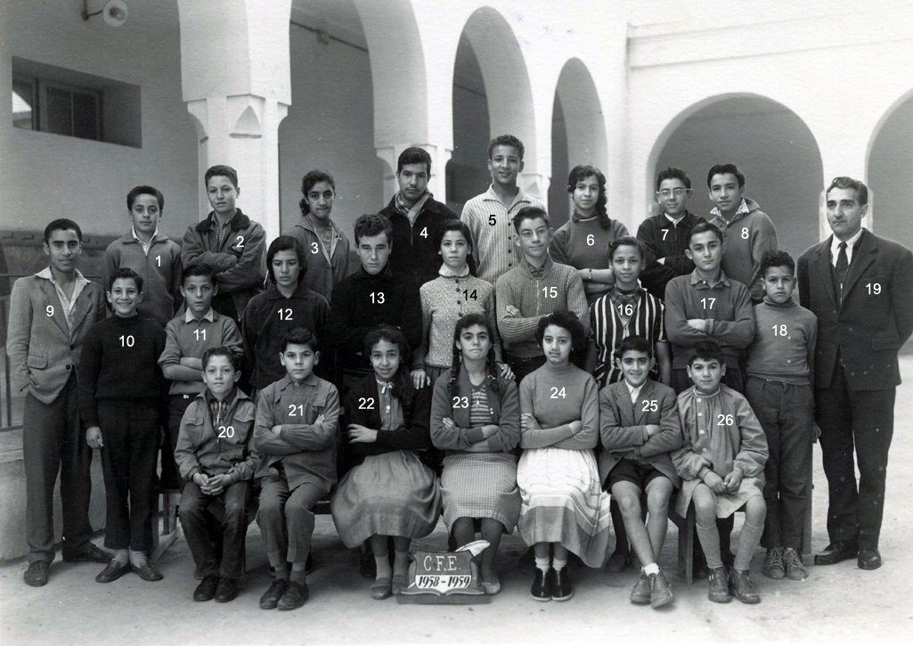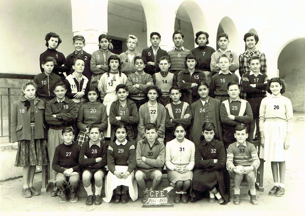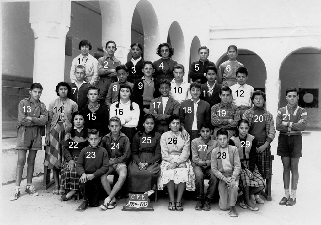 2 - GEOGET 4 - ROJEL 5 - BOIS Jean 7 - TORTEL 8 - VIAN Robert 9 - DESCRAMPS Guy 12 - BOUCHAÏB 14 - GILLOT Nicole 15 - FERNANDEZ Claudia 16 - AZEMARD Pierre 17 - POUQUET Claude 19 - DRISS 20 - MAISONNEUVE 22 - JACKY Francis 23 - M. VERTALIER (L'instit.) 24 - ALMODOVAR 25 - VIAN Georgette 26 - De PERRINI Christiane 27 - FABRE Jacqueline 28 - MARTINEZ Josette 29 - POMARES Michèle 30 - BLAYA Eléonore 31 - SIMEONI Gisèle 32 - PEREZ Anna 33 - RUPERT Monique 34 - TABONE Guy (Photo transmise
